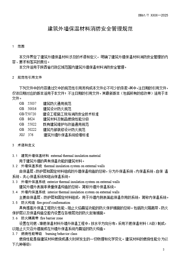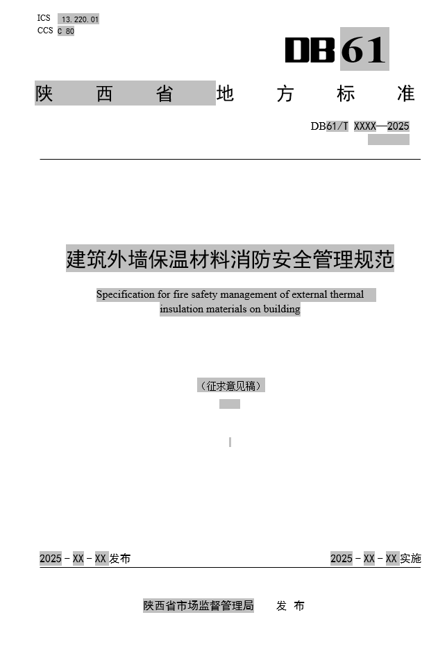 近日, 陕西省市场监管局发布了关于对《建筑外墙保温材料消防安全管理规范》等6项陕西省地方标准(征求意见稿)征求意见的通知。标准文本如下: