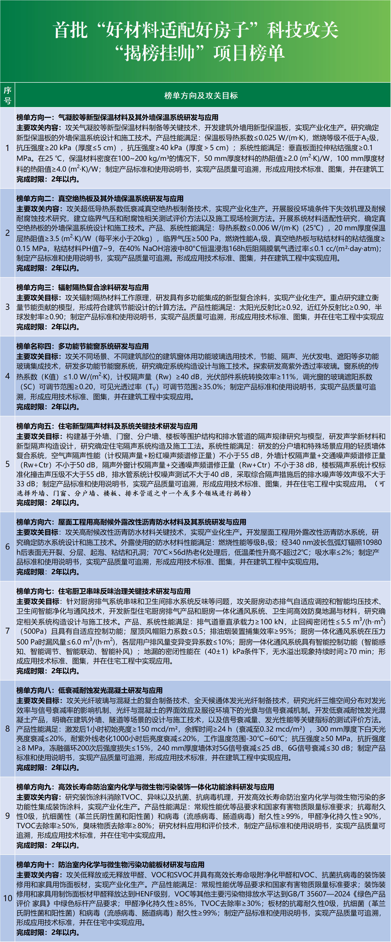2025年10月24日,中国建筑材料联合会联合住房和城乡建设部科技与产业化发展中心共同发布首批“好材料适配好房子”科技攻关“揭榜挂帅”项目榜单,其中涉及气凝胶、真空绝热板等。