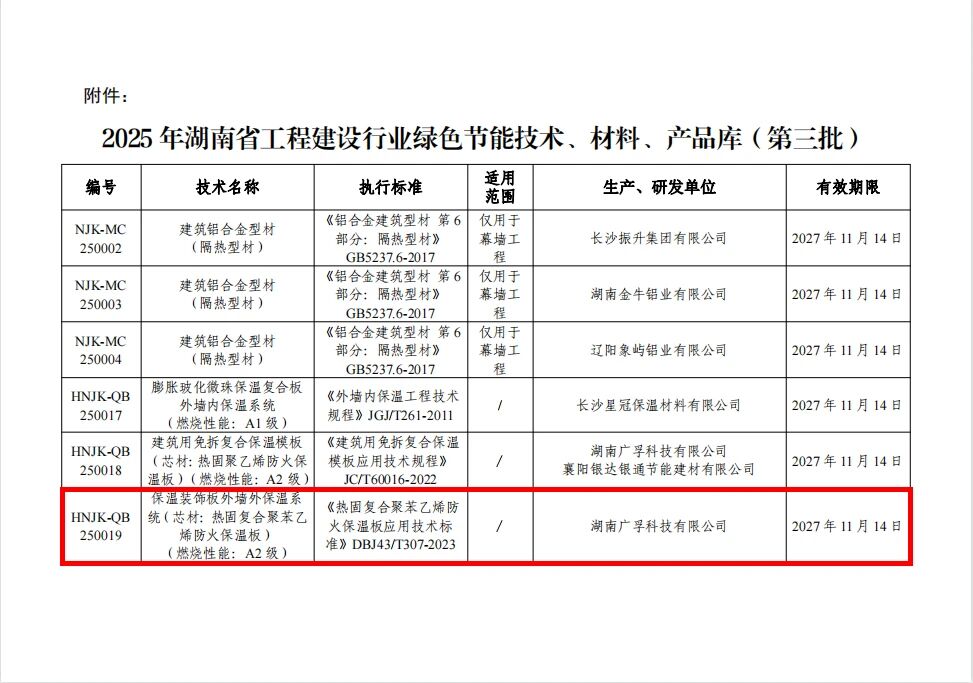 保温装饰一体板列入《2025年湖南省工程建设行业绿色节能技术、材料、产品库(第三批)》