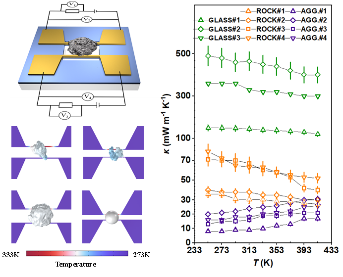 图3 悬臂式H型微纳热桥测试方法和月壤颗粒的本征热导率测试结果