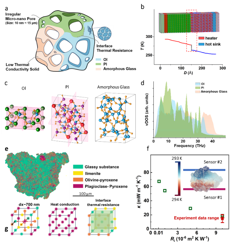 微观结构和矿物组分分析进一步揭示了胶结物超低热导率的物理机制。胶结物颗粒由非晶态熔融玻璃胶结多种矿物碎屑构成,内部高度不规则,并分布着纳米至微米尺度的多级孔隙网络。这种复合结构显著增强了声子散射与界面热阻,延长了热流路径,从而有效抑制热传导。进一步对比发现,胶结物颗粒的热导率并不单单取决于孔隙率,而更依赖于孔隙连通性及结构复杂度。具有更复杂物相界面和连通孔结构的颗粒,即使孔隙率较低,也表现出更低的热导率。分子动力学(MD)模拟结果表明,不同矿物相(如斜长石、橄榄石)与玻璃相之间存在显著的振动态不匹配,导致界面处声子传输效率降低。定量分析显示,理想晶体-晶体界面的热阻约为10-8 m2·K·W-1,而考虑纳米孔隙、缺陷及热流路径弯曲后,其等效界面热阻可提升至约10-5 m2·K·W-1。这一数量级的跃升,充分说明了微观结构与缺陷在抑制热传导中的主导作用。相较于理想致密矿物,具有多尺度孔隙与复杂界面的胶结物,其热导率降至晶体传热水平的约12%。研究团队进一步构建了从微观结构到介观热导率的跨尺度模型。通过将界面热阻及含缺陷矿物相的热导率引入有限差分模拟,验证了复杂界面结构、多尺度孔洞与缺陷在整体热传导中的控制地位。值得指出的是,真实月表环境中还存在太阳风辐照、电荷积累及其他物理-化学耦合作用,这些因素对颗粒热传导行为的进一步影响仍有待探索。