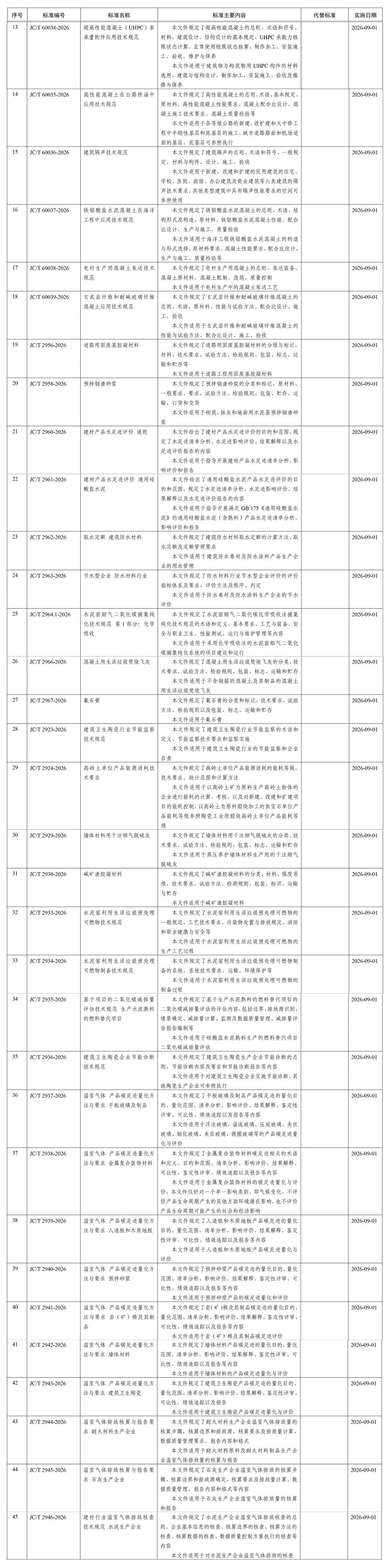 建材行业标准编号、名称、主要内容如下表: